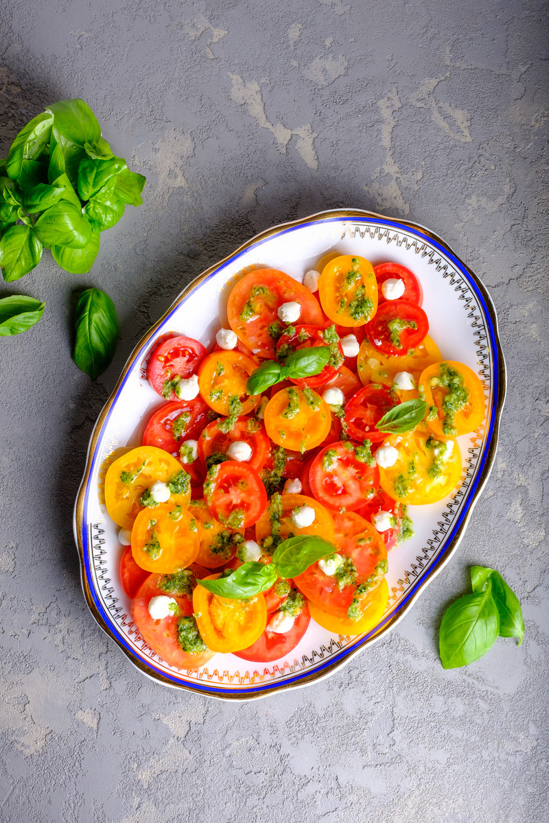И количество ингредиентов зависит от вашего предпочтения: больше помидоров или сыра. Обычно в салате применяют много помидоров и немного сыра, так как не все любят рассольные сыры.