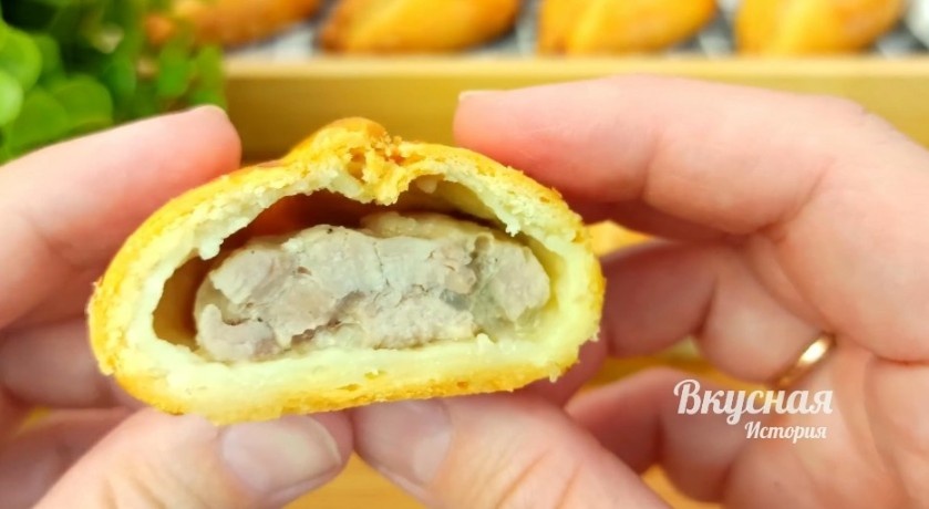 Начинка проста и практична: 400 г филе индейки нарезаем небольшими кусочками, дополняем 1–2 луковицами, солью и перцем по вкусу, добавляем 2 столовые ложки холодной воды и хорошо перемешиваем. Это изделие держит форму и не требует сложной подготовки. Когда тесто охладится, делим его на две части, раскатываем каждую в лепешку и раскладываем по 1 столовой ложке начинки. Защипываем края, отправляем пирожки на противень, смазываем смесью желтка и молока и выпекаем при 180°C около 35–40 минут до красивой корочки.