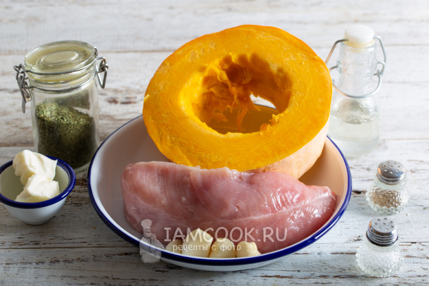 После обжаривания индейки, в форму для запекания укладываются подготовленные кубики тыквы. Сверху размещается мясо, которое необходимо посолить (1 ч.л.), добавить 0,5 ч.л. смеси прованских трав и черный молотый перец. Для удивительного аромата и сочности сверху помещаются 5-6 очищенных, но не нарезанных зубчиков чеснока, а также оставшиеся 20 г сливочного масла, нарезанного кубиками.