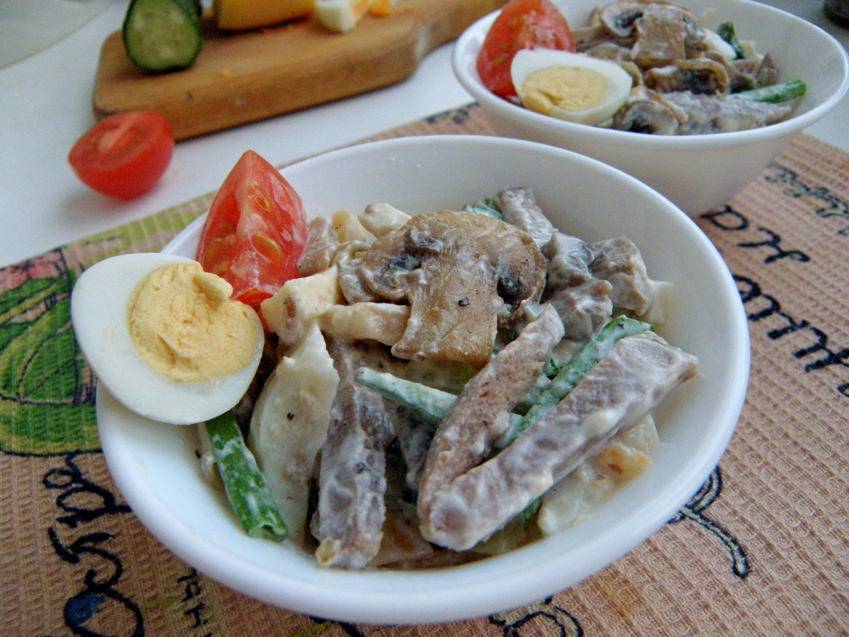 Отварите куриную грудку или используйте готовую колбасу. Нарежьте грибы и обжарьте их. Яйца отварите и порежьте на четвертинки или натрите на терке раздельно.