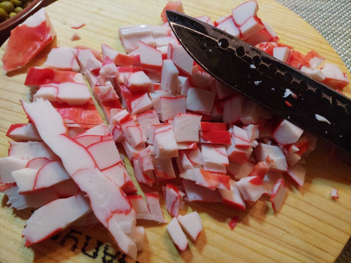 Приготовление начинается с нарезки крабовых палочек или мяса на небольшие кубики и отправления их в большую чаша. Туда же добавляется нарезанный огурец, болгарский перец, измельчённые варёные яйца и зелёный горошек.