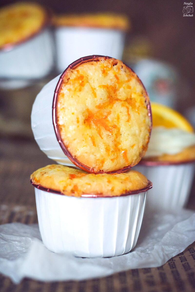 Формы для кексов заполнить смесью наполовину, немного больше, и подготовить апельсиновый сахар, смешав цедру с сахаром. Посыпать получившуюся массу сверху и поместить в заранее разогретую до 180°C духовку на 20 минут. Готовность проверяется деревянной палочкой — она должна оставаться сухой.