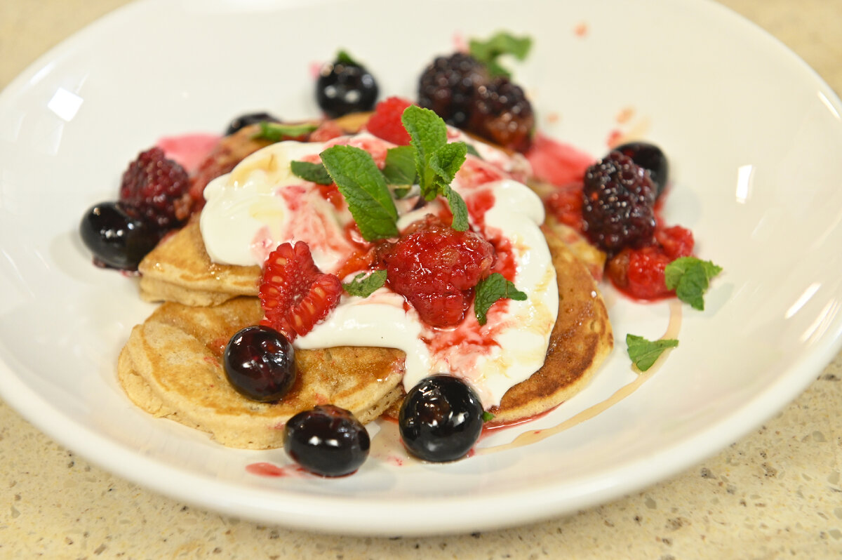 8. Готовые оладьи выложить на тарелку, украсить сметаной, полить кленовым сиропом и свежими ягодами.