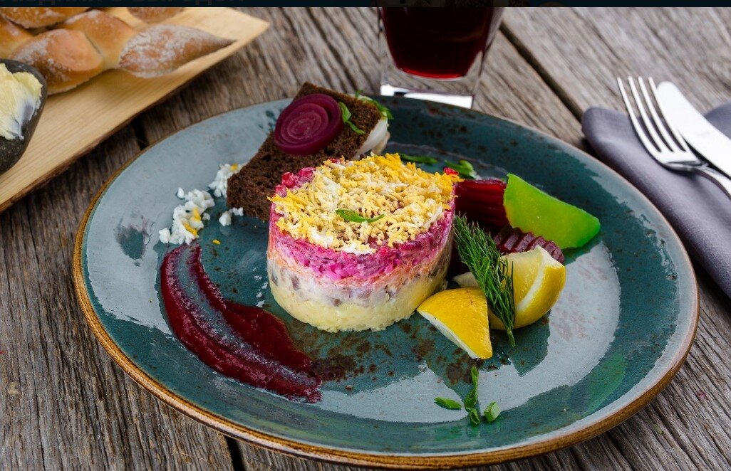 Этот яркий и аппетитный праздничный салат впечатляет не только своим внешним видом, но и сбалансированным вкусом. Один из слоев включает свежие зеленые яблоки, которые придают оригинальный оттенок известному блюду.