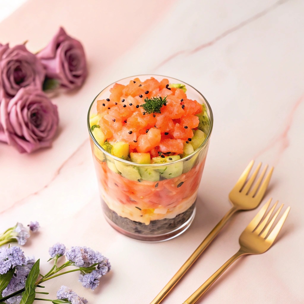 Ингредиенты: Лосось (200 г), Авокадо (1 шт.), Семена чиа (1 ст. л.), Лимонный сок (2 ст. л.), Оливковое масло (1 ст. л.), Укроп, Соль и перец по вкусу.