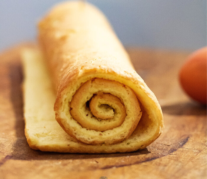 Если планируется рулет, стоит сразу его скатать, чтобы он привык к новой форме. Фисташковый бисквит для торта Буше де Ноэль готов, и пускай пока ждет своего часа в холодильнике.