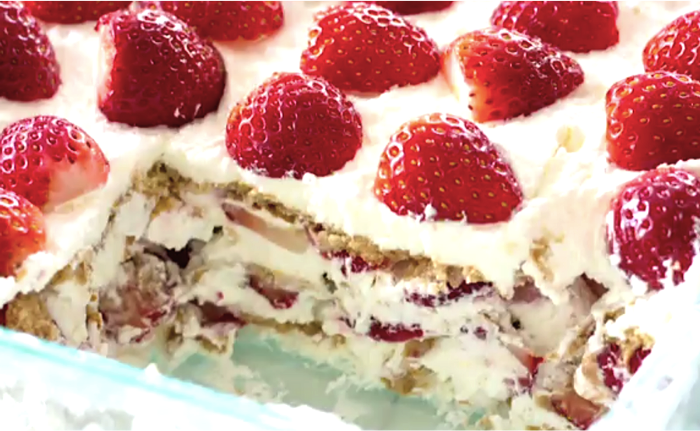В миксере соединяются маскарпоне, сливки, сахар и ванильный экстракт, чтобы получить однородный крем. В отдельной емкости следует смешать клубничный джем с водой и бальзамическим уксусом (если десерт не предназначен для детей, можно заменить воду на просекко). Печенье обмакивается в эту смесь и укладывается на дно формы. Затем следует слой крема и нарезанной клубники. Этот процесс повторяется дважды. Готовый торт накрывается пленкой и помещается в холодильник минимум на 8 часов.