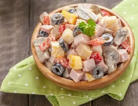 Ветчину и картофель нарезать кубиками, грибы и сладкий перец – ломтиками, маслины – кружочками. Все ингредиенты смешать, приправить солью и перцем, добавить майонез. Завершающим штрихом станет зелень для украшения. По желанию ветчину можно заменить домашней бужениной или отварной куриной грудью.