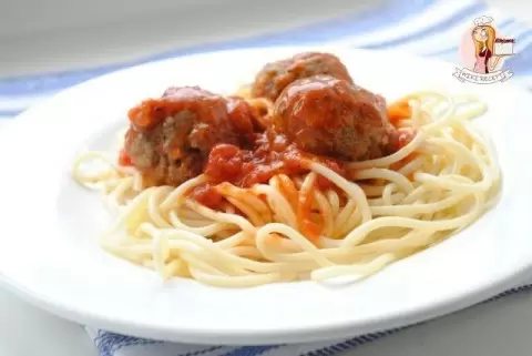 Пока фрикадельки томятся, отварить спагетти в подсоленной воде. На большое блюдо выложить спагетти, сверху добавить фрикадельки и щедро полить томатной подливкой.