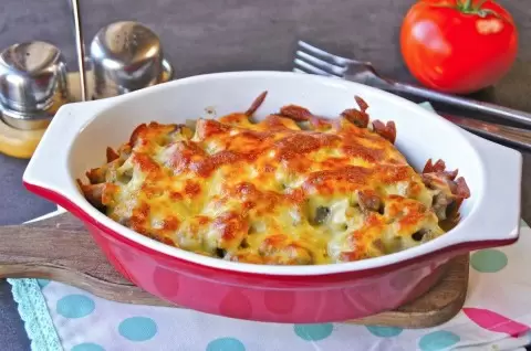 Добавив сливки, всё это доводим до кипения, а затем уменьшаем огонь и продолжаем готовить до загустения. Не забудьте посолить по вкусу. После этого смесь свинины и грибов укладываем в жаропрочную посудину, посыпаем тертым сыром и запекаем в разогретой до 190°C духовке до образования румяной корочки.