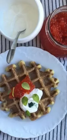 2. Жарка: Разогрейте форму для вафель и выкладывайте на неё тесто с помощью ложки. Выпекайте в течение 3-4 минут до появления аппетитной корочки.