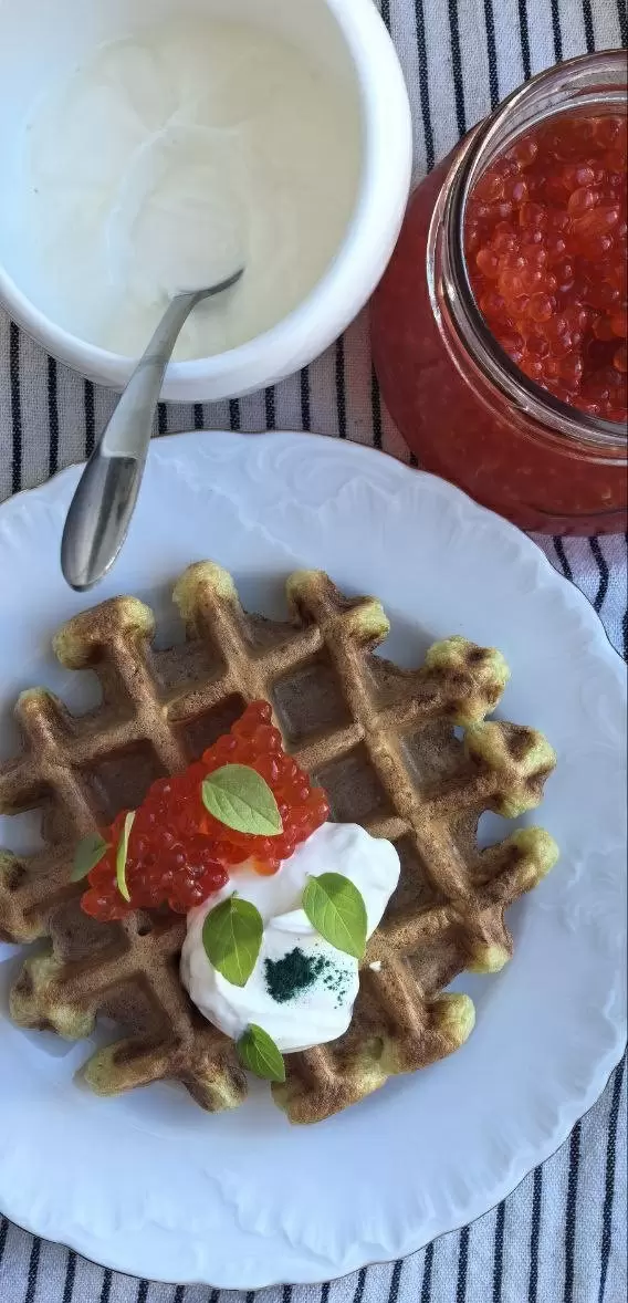 3. Подача: Готовые вафли выложите на тарелку, щедро полейте сметаной и аккуратно добавьте имитацию икры сверху. Для улучшения подачи можно украсить блюдо свежей зеленью и специальной добавкой, такой как спирулина, чтобы сделать внешний вид ещё более ярким и привлекательным.