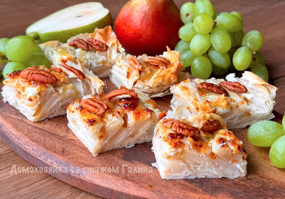 Сочетание груш и нежного сыра дорблю обретает новую жизнь в этом изысканном пироге, который станет ярким акцентом на любом столе. Тонкое филло-тесто позволяет создать легкую и хрустящую корочку, завершая гастрономический шедевр. Этот десерт идеален как в паре с бокалом вина, так и с чашечкой ароматного кофе.