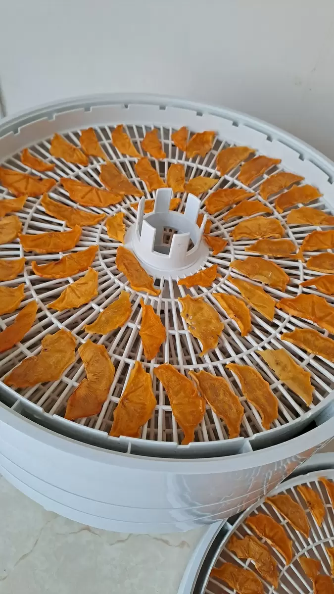- Разложите ломтики хурмы на поддонах электросушилки в один слой, оставляя между ними небольшое расстояние для лучшей циркуляции воздуха.