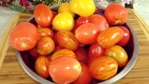 Помидоры для этой заготовки могут быть любые – тут нет строгих требований к сортам. Некоторые хозяйки предпочитают очищать плоды от кожицы, однако можно обойтись и с ней. В качестве дополнения можно добавить репчатый лук — он придаёт готовому блюду особый вкус, но при желании его можно и не использовать.