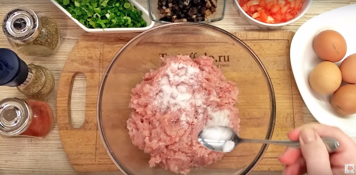 Пока мясные основы выпекаются, можно заняться начинкой. Для этого мелко нарезаются отварные грибы, помидоры и зеленый лук. В отдельной миске разбиваются три яйца, к ним добавляется две столовые ложки йогурта. Заправка подсоливается и перемешивается.