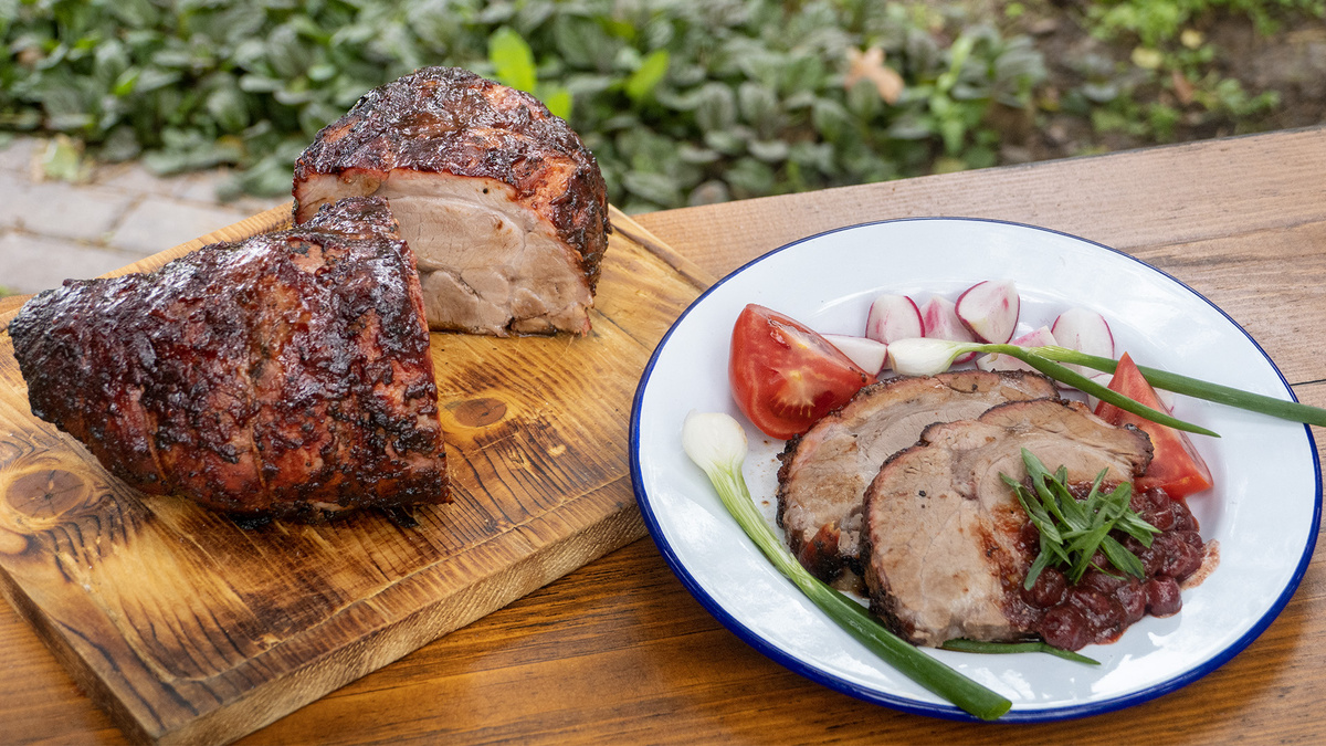 Тем временем можно приступить к вишневому соусу. Размороженную вишню выкладывают на противень, смешивают с кетчупом, паприкой, сушеным чесноком, винным уксусом и сахаром. Приправляют по вкусу солью и перцем, и отправляют на угли до кипения. Как только соус закипит, необходимо обильно смазать им уже запечённую свиную шею и вернуть на гриль на 15 минут.