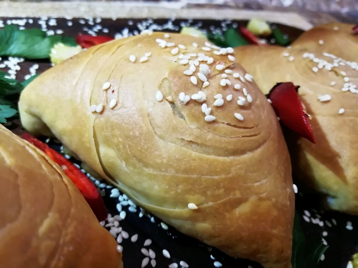 Выпекание: Выкладываем пирожки на противень швом вниз, смазываем растительным маслом и, по желанию, посыпаем кунжутом. Выпекаем при температуре 180°C до золотистой корочки, примерно 25-30 минут.