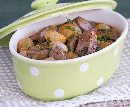 Теперь настало время создать главный шедевр. В небольшой глиняный горшок укладываются все подготовленные ингредиенты. Сначала добавляют обжаренную баранину, затем картофель, чернослив и лук, а следом помидоры, очищенные от кожицы и нарезанные кубиками. Не забываете добавить соль, перец и лавровый лист. Завершающим аккордом станет топленое масло и бульон, который заливает все содержимое горшка.