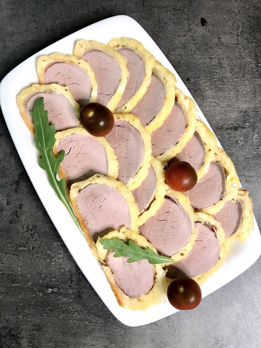 После того как сырная основа готова, выложите на нее замаринованную вырезку, заверните все в сырный блин и снова укройте пергаментом и фольгой. Запекайте в предварительно разогретой до 190-200 градусов духовке около одного часа — время может варьироваться в зависимости от размеров мяса.