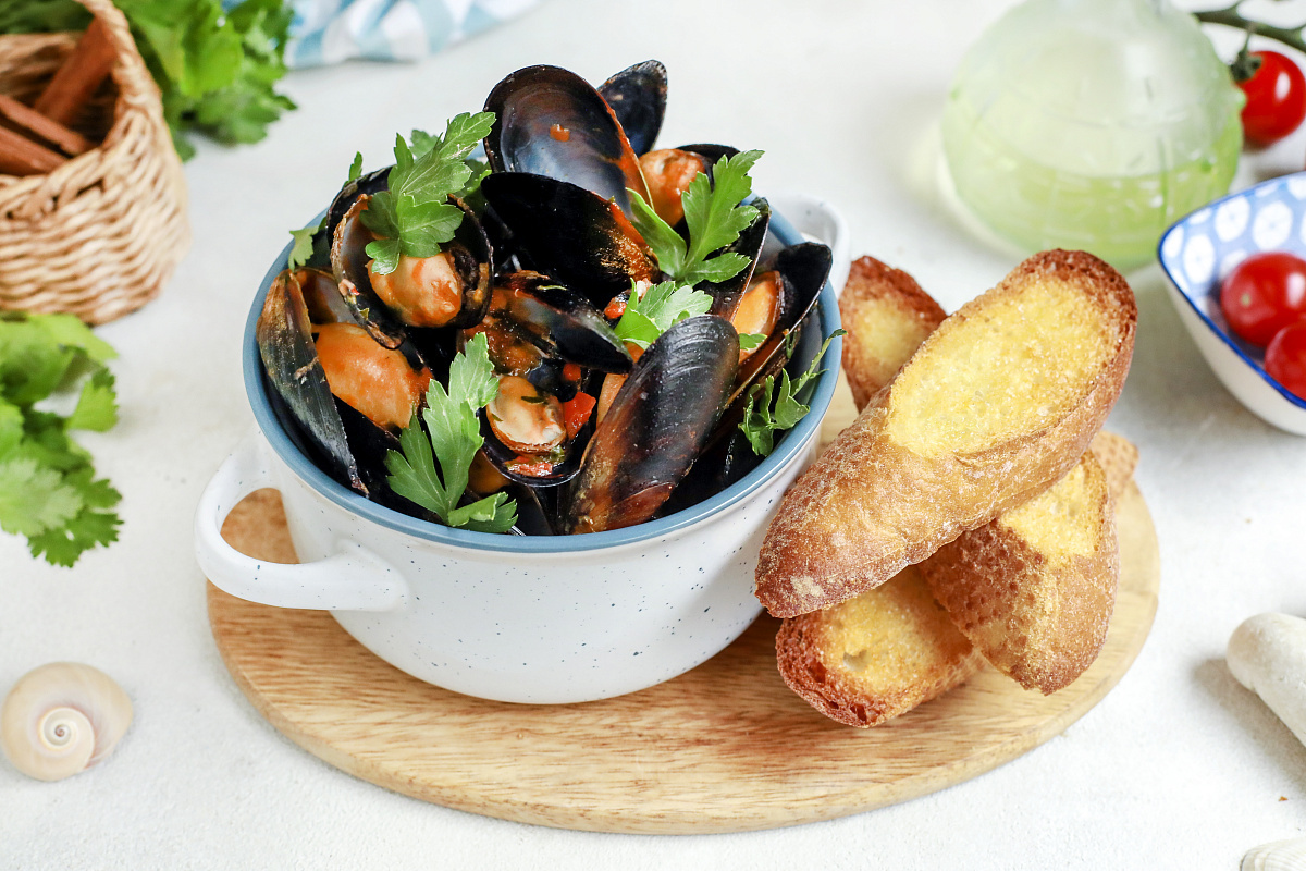 Шаг 1: Особенно важно тщательно осмотреть мидии: промойте и очистите их. Открытые мидии допустимы, однако повреждённые или треснувшие следует выбросить. Если необходимо, удалите скорлупки.