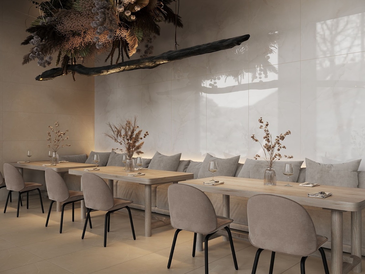 Крупноформатный керамогранит — отличный выбор для создания выразительного фокуса интерьера. Благодаря минимальному количеству швов крупные плиты создают ощущение монолитности, что идеально подходит для ресторанов.