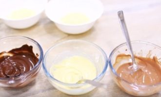 Затем взбейте охладившиеся сливки до воздушной консистенции: начните с низкой скорости, постепенно увеличивая обороты. Полученную массу разделите на три равные части. В первую добавьте белый шоколад и стружку белого шоколада, во вторую соответствующим образом — молочный шоколад, а в третью — черный. Каждый слой аккуратно перемешивайте.