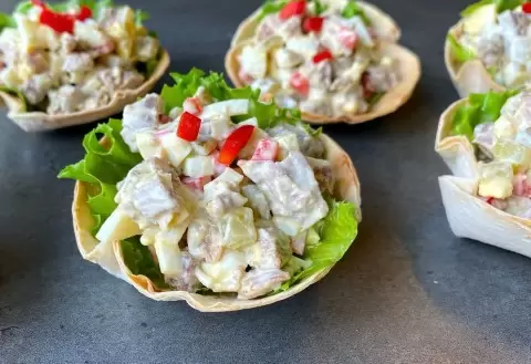 Не забудьте на дно тарталеток положить листики свежего салата, который не только украсит закуску, но и предотвратит размягчение основы от сока.