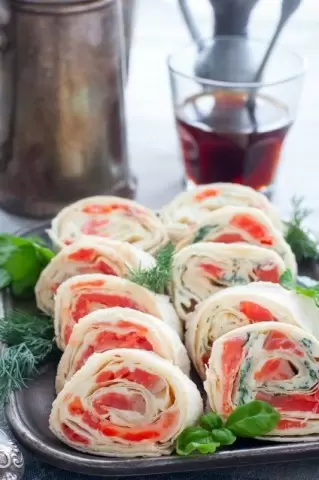 Аккуратно поместите первый лист лаваша на второй и сверните рулет. Заверните рулет в пленку и уберите в холодильник на несколько часов для застывания. Перед подачей нарежьте рулет на порционные кусочки с помощью острого ножа, украсьте листьями салата и свежей зеленью.