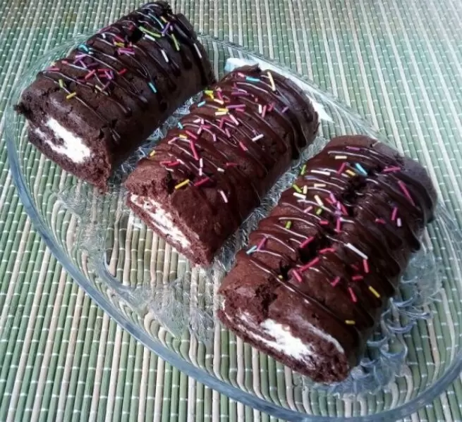 После этого бисквиты разворачиваются, обмазываются кремом и сворачиваются в рулеты. Готовые рулеты помещаются в холодильник на 20-30 минут.