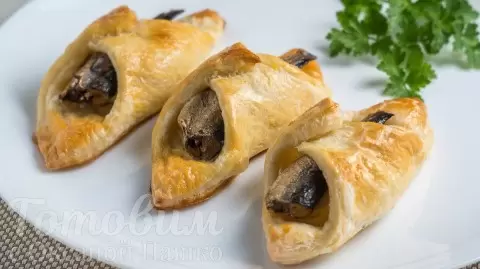2. Подготавливаем начинку. Вареные яйца нарезаем кружочками, а шпротам отрезаем хвостики. Размораживаем слоеное тесто и раскатываем его до толщины 2 мм, нарезая на квадраты со стороной 8-9 см.