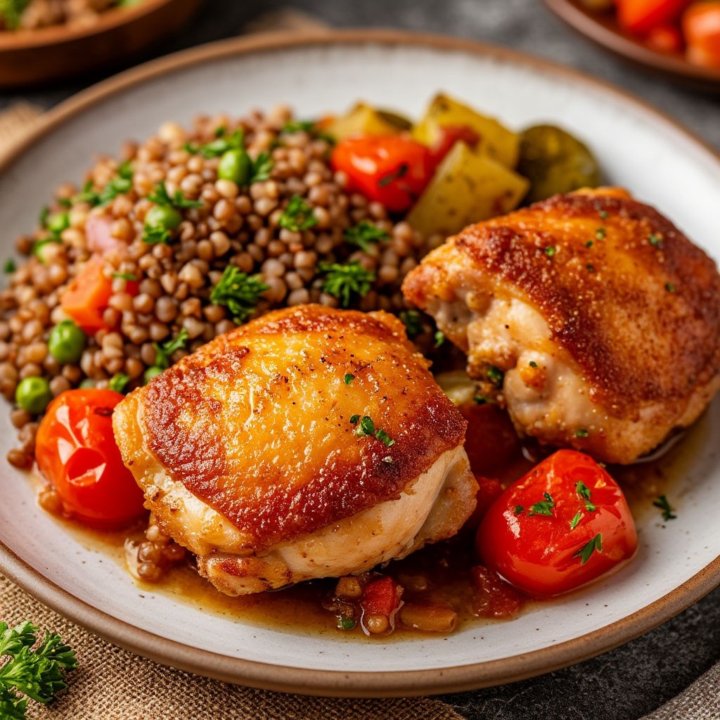 Приготовление начинается с подготовки курицы: промыть бедра, обсушить, а затем приправить солью, перцем, паприкой и чесноком. На сковороде разогреть растительное масло, выложить курицу кожей вниз и жарить примерно 7–10 минут до золотистой корочки. После этого перевернуть мясо, накрыть крышкой и готовить еще 10–15 минут на среднем огне.
