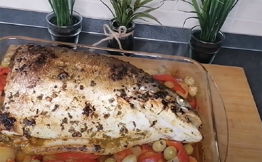 В отдельной миске разводим томатную пасту водой, добавляем специи, щепотку сахара и немного оливкового масла. Этим соусом поливаем овощи, а сверху выкладываем маринованную рыбу. Накрываем форму фольгой или пергаментом. Запекаем в разогретой до 180 градусов духовке в течение 40–45 минут. При использовании дровяной печи вкус блюда станет гораздо более насыщенным.