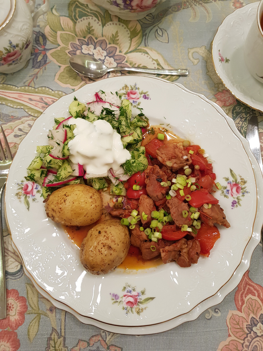 На тарелки красиво выложить запечённый картофель, тушёную свинину, дополнить свежим салатом. Можно посыпать мясо нарезанным зелёным луком для яркости. Такой деревенский ужин подарит удовольствие и уникальную атмосферу благодаря щедрости природы на вкусные свежие продукты. Приятного аппетита!