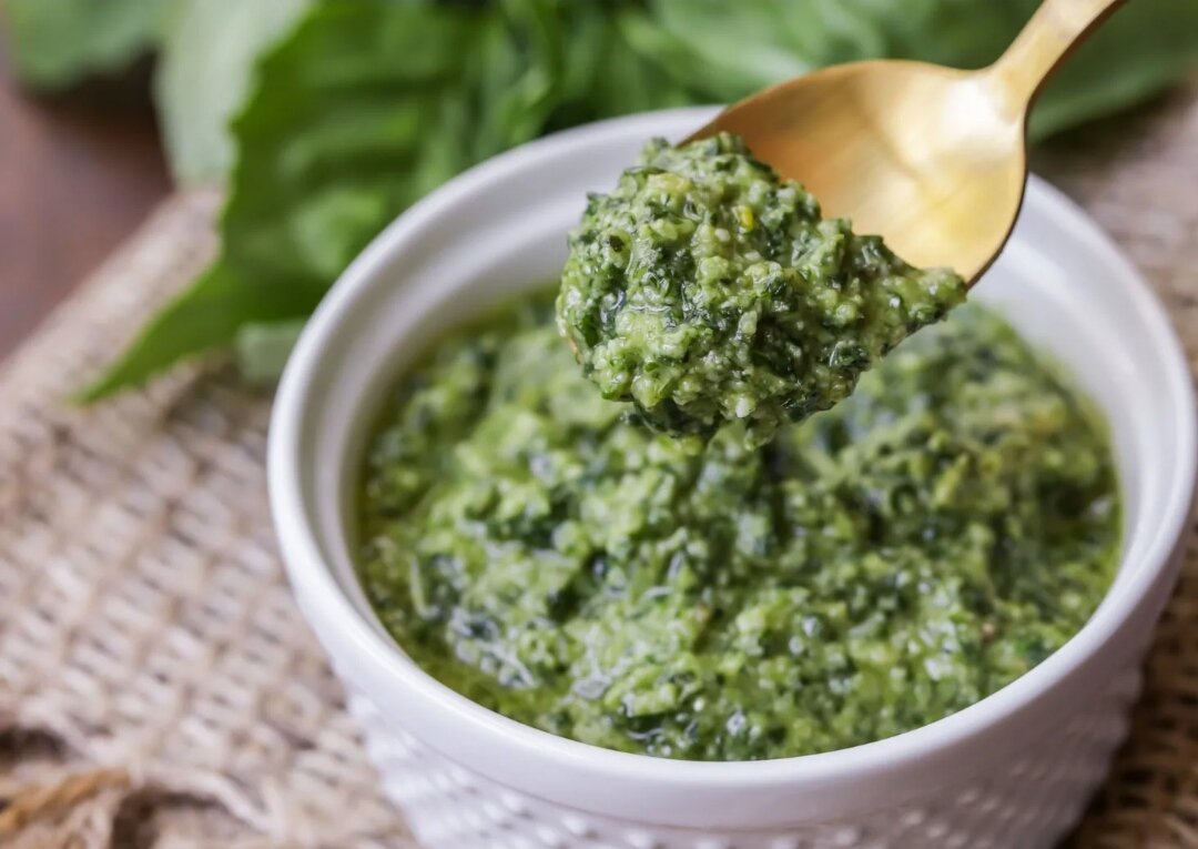 Все зелёные ингредиенты — сныть, щавель, мангольд и шпинат — необходимо промыть и бланшировать в кипящей воде. Затем измельчите их в мясорубке. На сковороде разогрейте растительное масло и обжарьте нарезанный кубиками репчатый лук до прозрачности. В конце добавьте мелко нарезанный чеснок, подготовленные травы и приправьте солью и перцем. Готовьте ещё 3 минуты. После остывания подавайте в холодном виде.