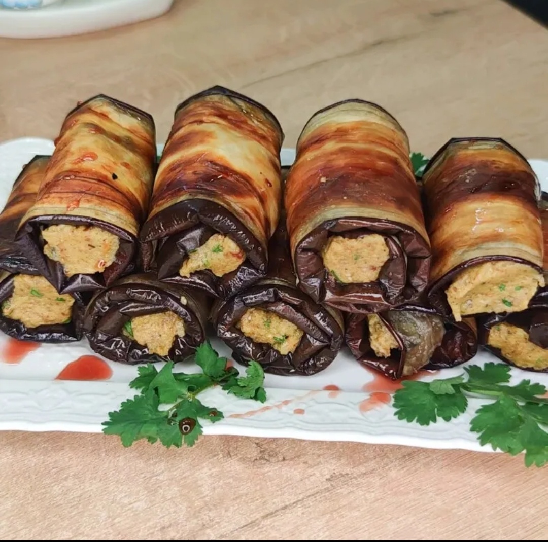 На подготовленные ломтики баклажанов кладут начинку и аккуратно сворачивают в рулетики. Подают с гранатовым соусом или свежими зернами граната для яркого акцента.