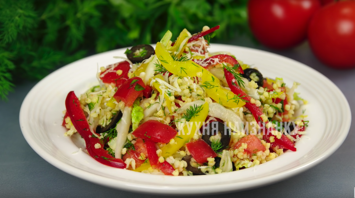 Готовое пшено выложите в салатник, добавьте подготовленные овощи и зелень. Не забудьте seasoning: соль и перец по вкусу. Заправьте всё ароматным растительным маслом — подойдет как подсолнечное, так и оливковое или кукурузное.